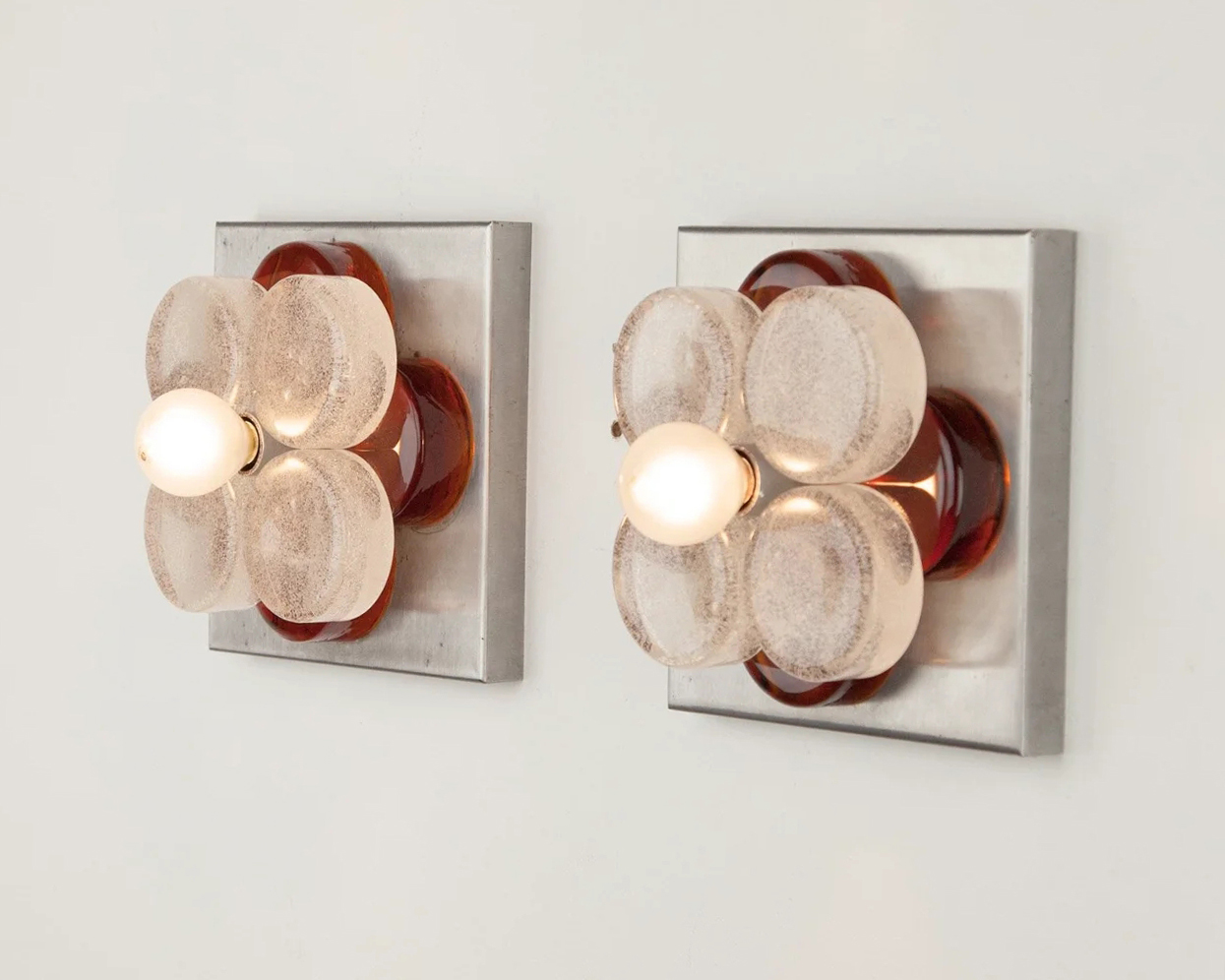 Italian Retro Wall Lamp by Poliarte, Italy, 1960s, A striking blend of hand-blown crystal bubble glass blocks and a sleek square stainless steel wall mount. Designed in the shape of a four-leaf clover, this lamp casts a distinctive glow that brings a touch of vintage charm and individuality to any interior.