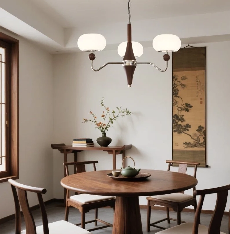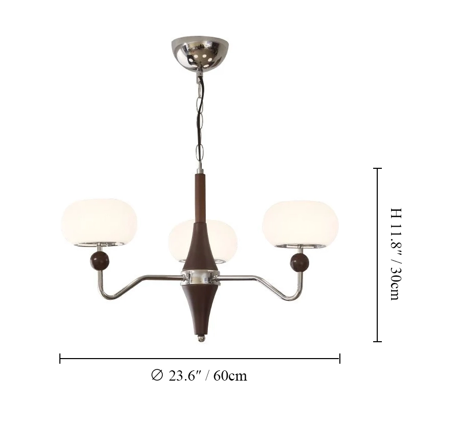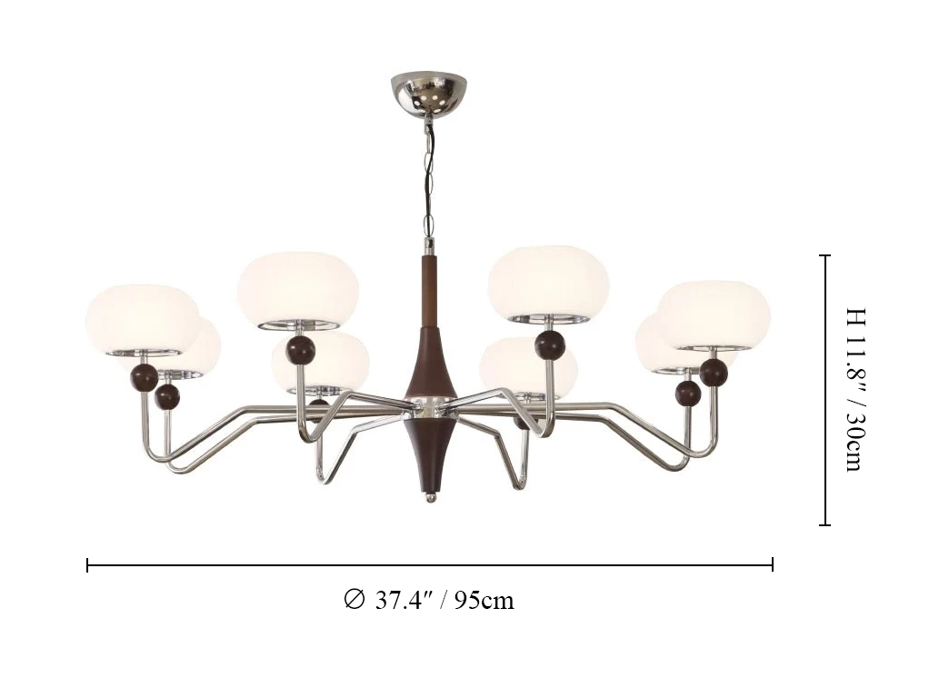 The Nimira Chandelier is a captivating study in sculptural form and refined contrast. Eight gracefully curved steel arms extend outward, each accented with walnut spheres and finished with softly ribbed opal glass shades, creating a harmonious rhythm of texture and symmetry. Anchored by a tapered wooden center, it radiates warmth with a touch of mid-century modern flair. Both artistic and functional, the Nimira makes a striking statement in dining rooms, lounges, or thoughtfully curated open spaces.