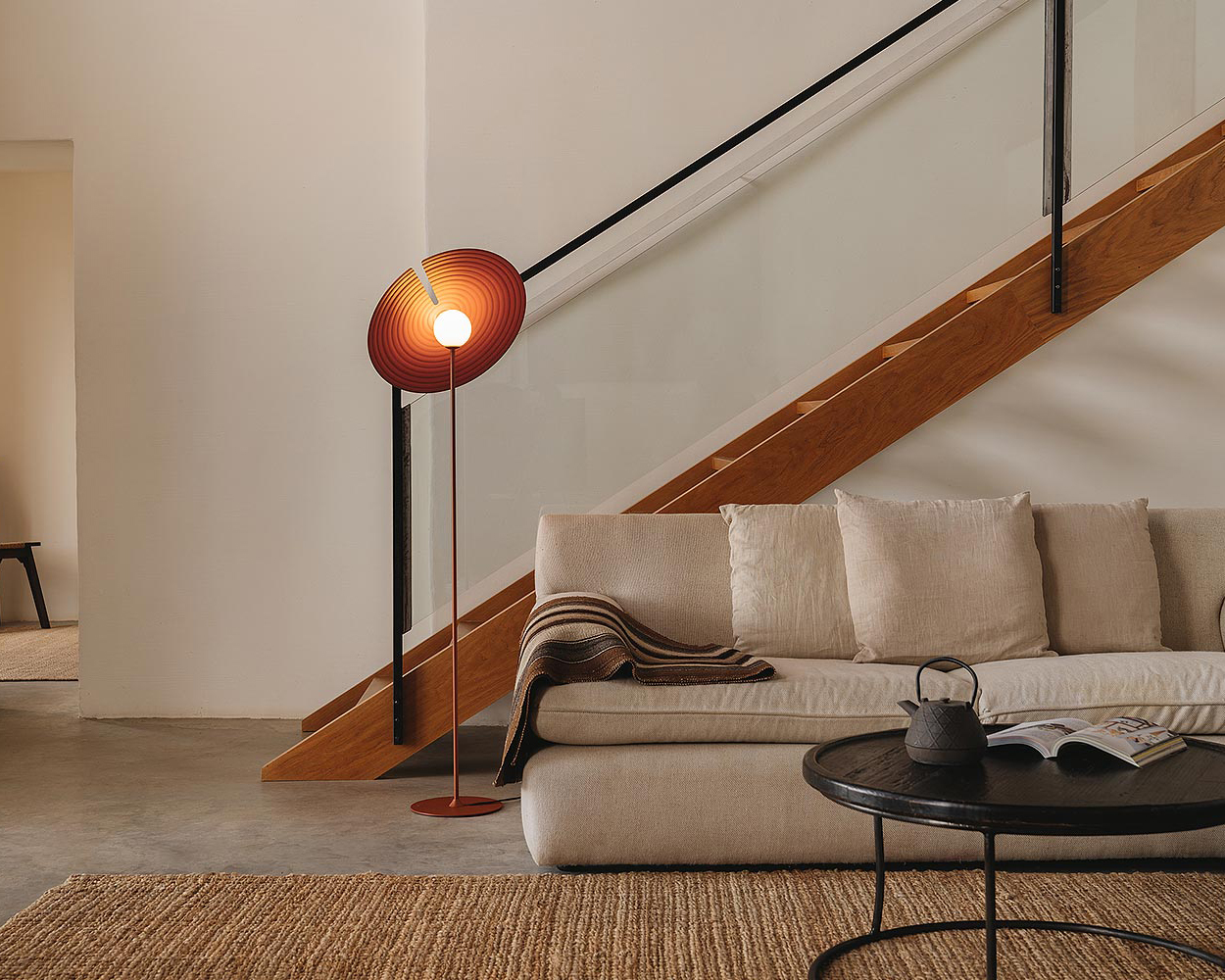 The Orbit Disc Floor Lamp combines sculptural clarity with quietly expressive light. Its rotating disc shade features a refined concentric texture, creating a gentle interplay of shadow and glow.