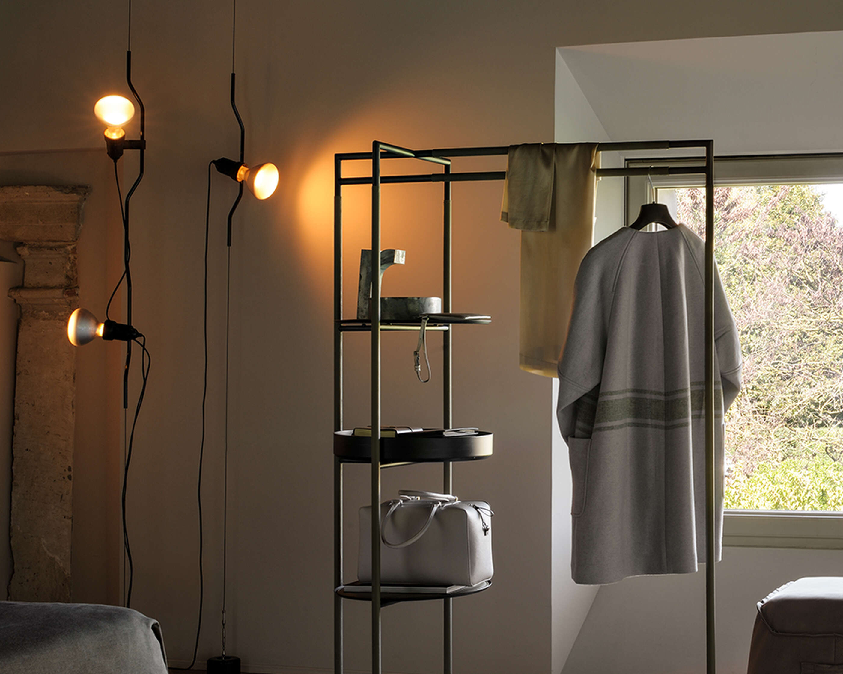 The Pause Floor Lamp captures the essence of a bracket — a pause suspended between ceiling and floor. Its slender cable and adjustable spotlight create a vertical line of light that feels both architectural and poetic.