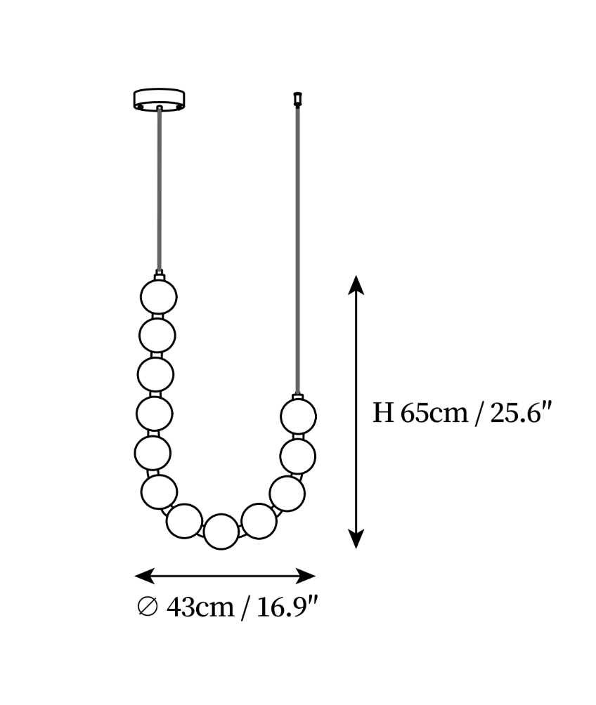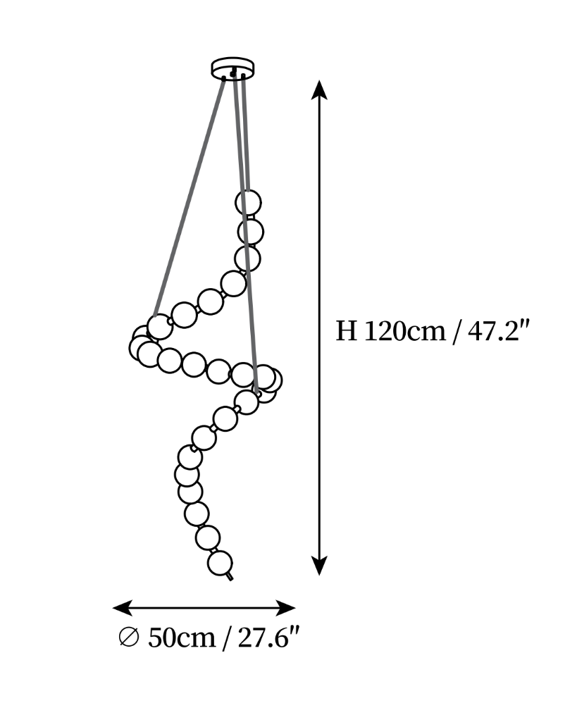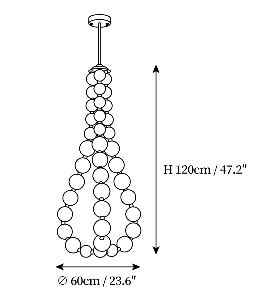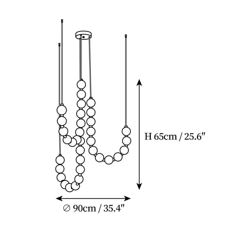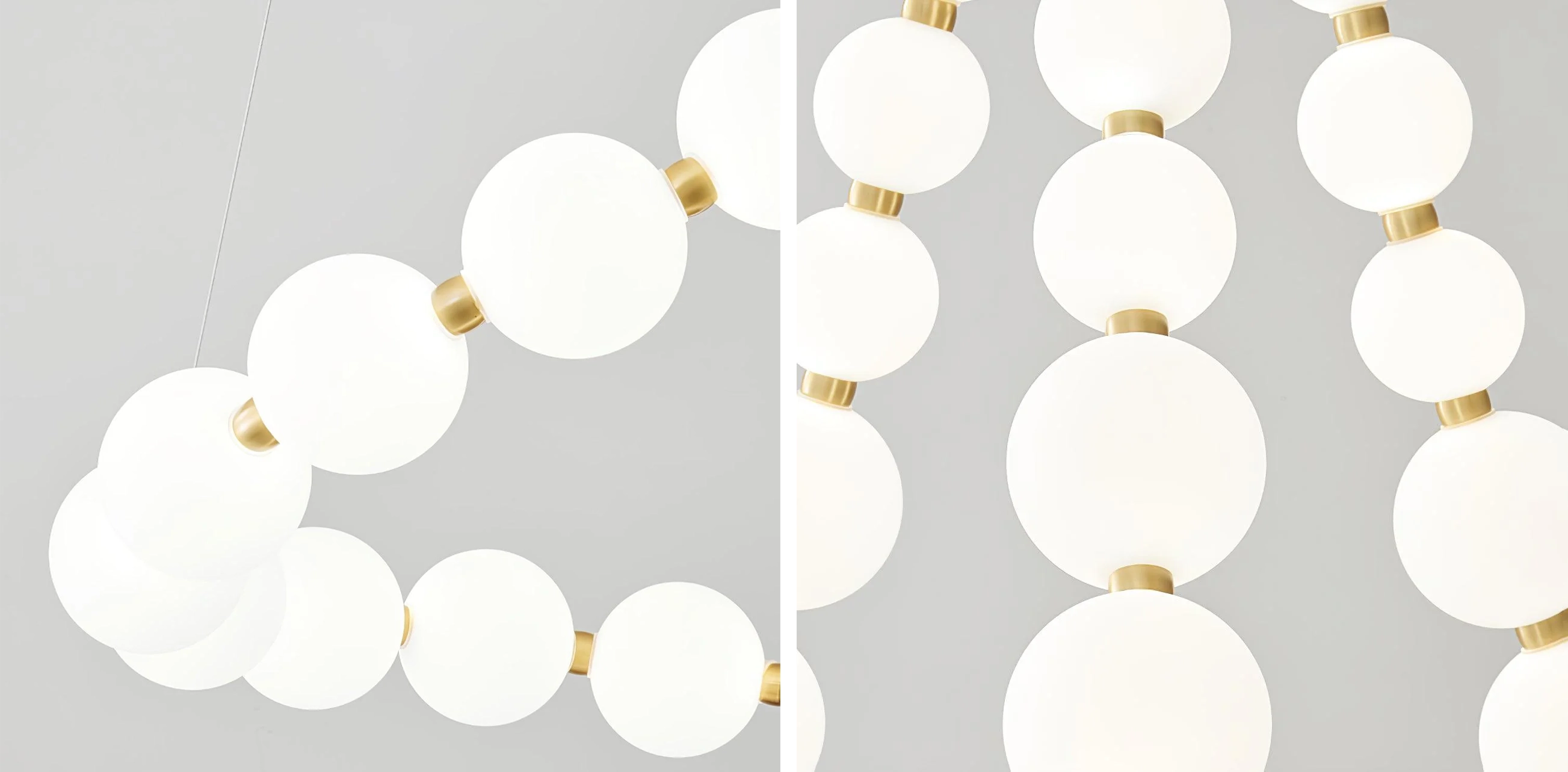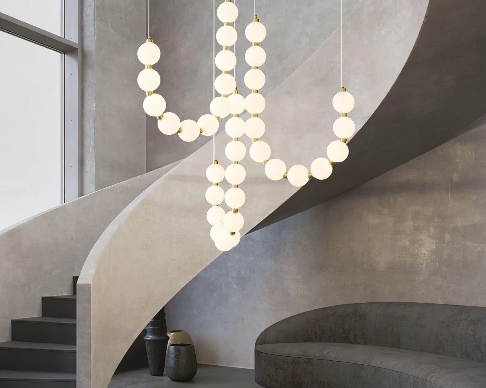 Inspired by the graceful form of a pearl necklace, this chandelier features strands of glowing white orbs suspended from a brass-accented frame. Its sculptural silhouette adds both sophistication and warmth, casting a soft, ambient light that enhances any modern interior. Perfect for double-height spaces or grand staircases, it creates a welcoming atmosphere ideal for gatherings and intimate family moments.