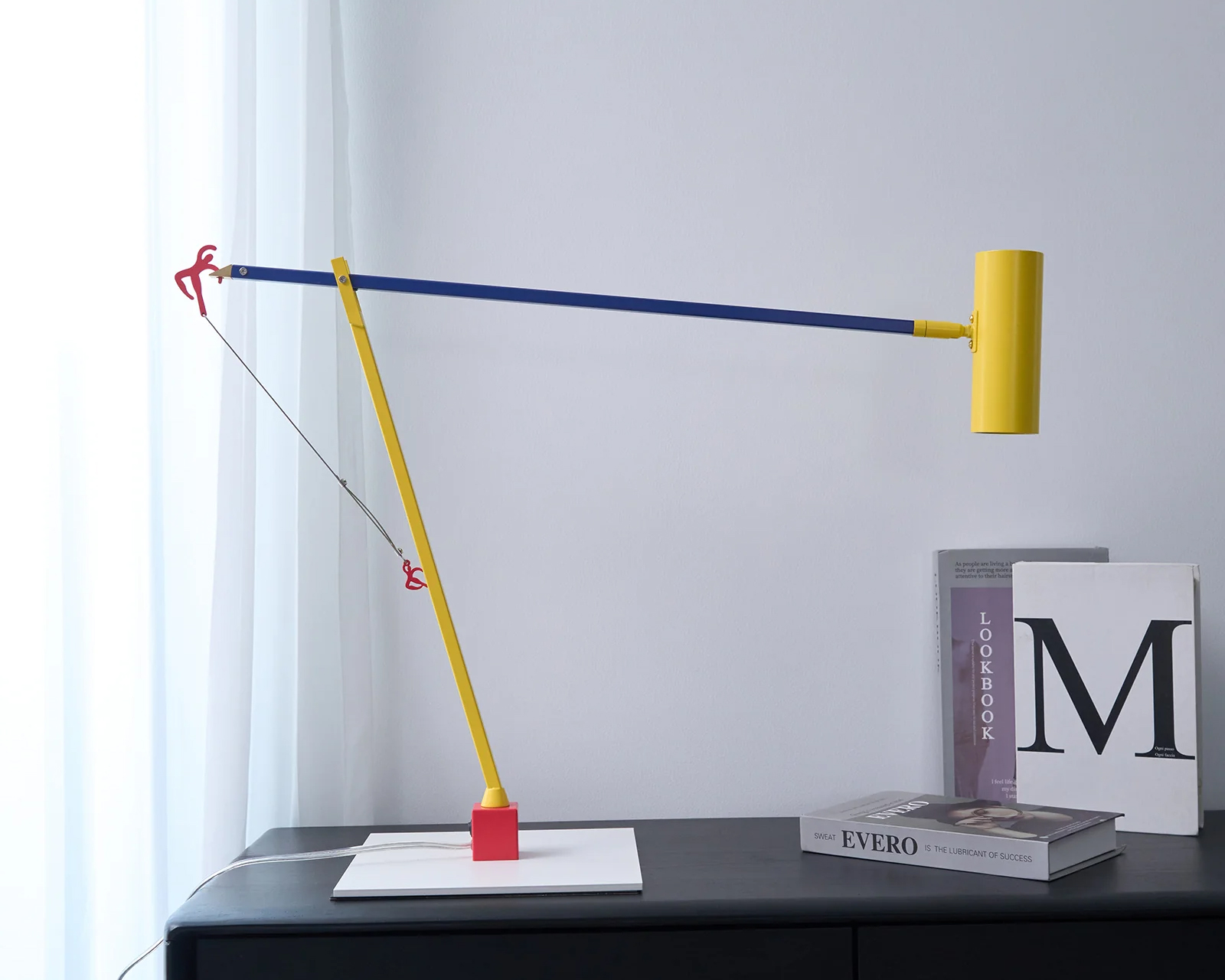 A sculptural red figure anchors the lamp’s personality, serving as both a functional counterbalance and an artistic accent. The refined palette of primary colors echoes themes of motion, balance, and creative renewal, giving the lamp a distinctive visual rhythm.