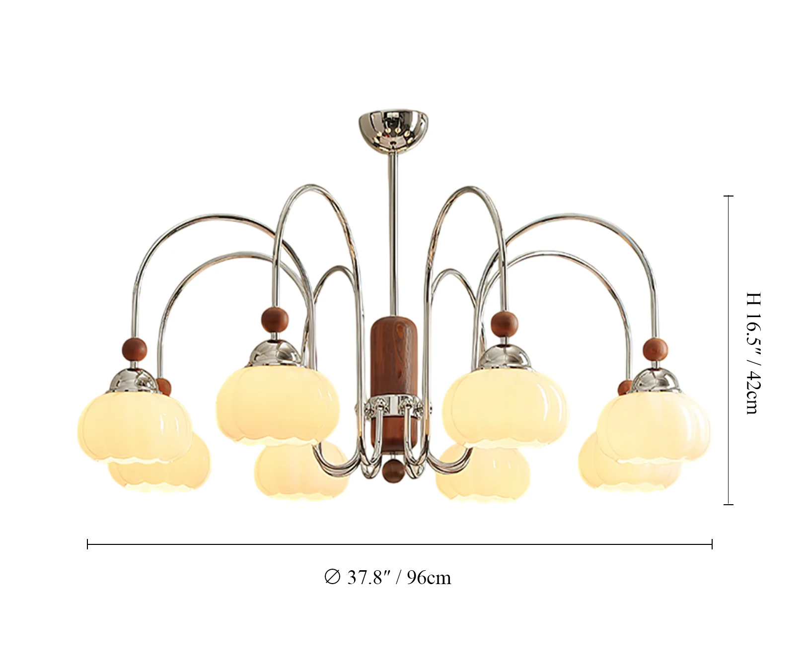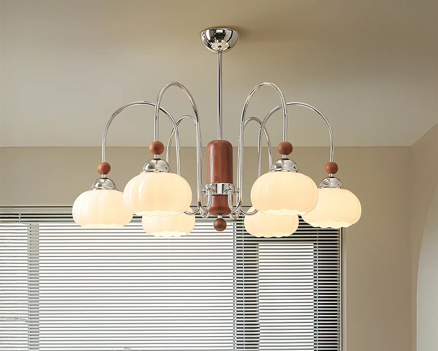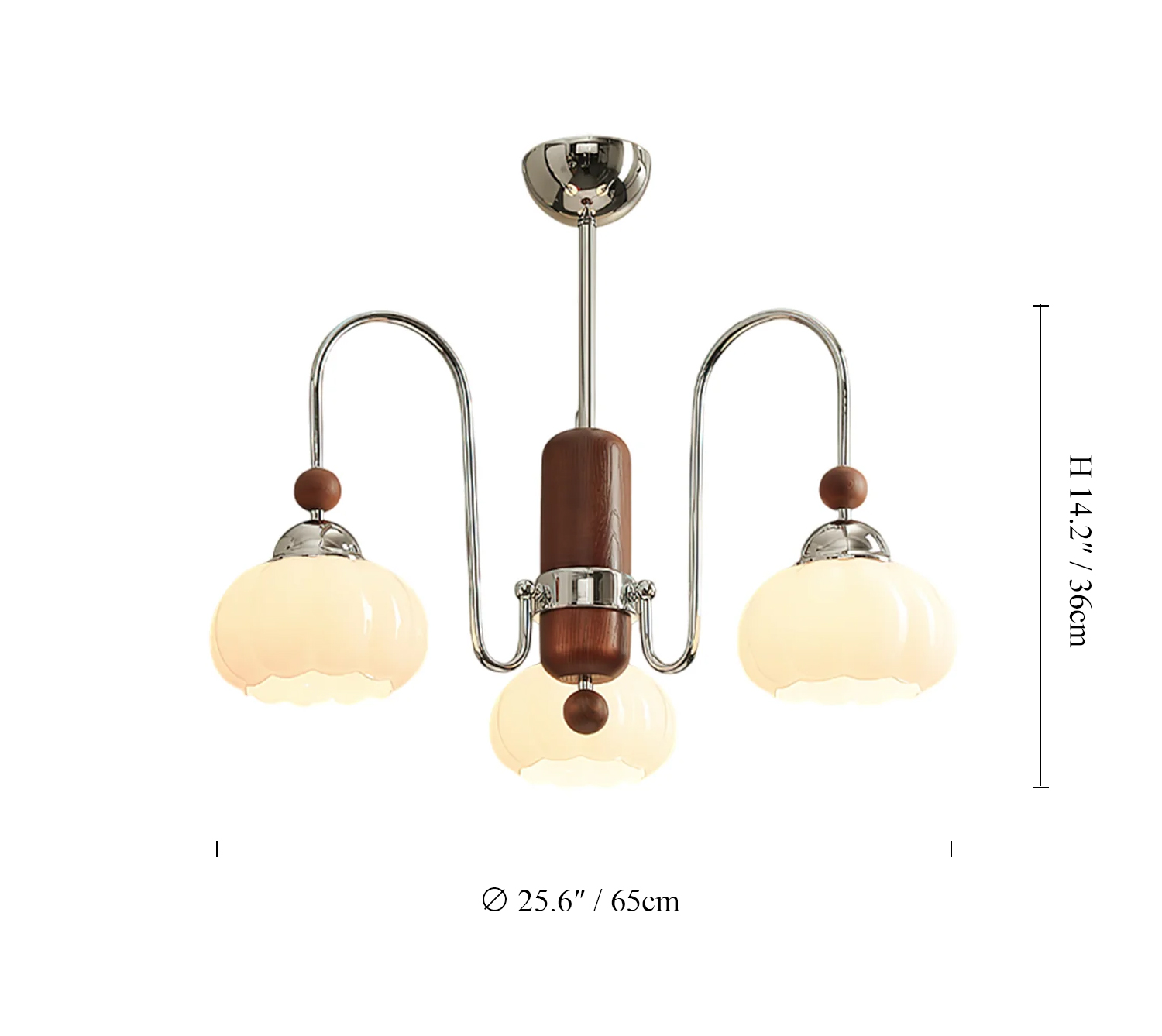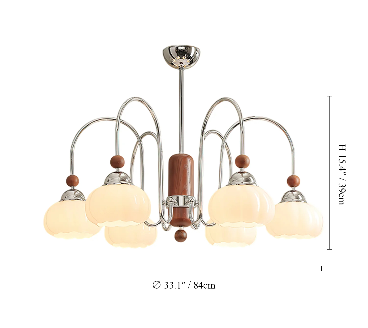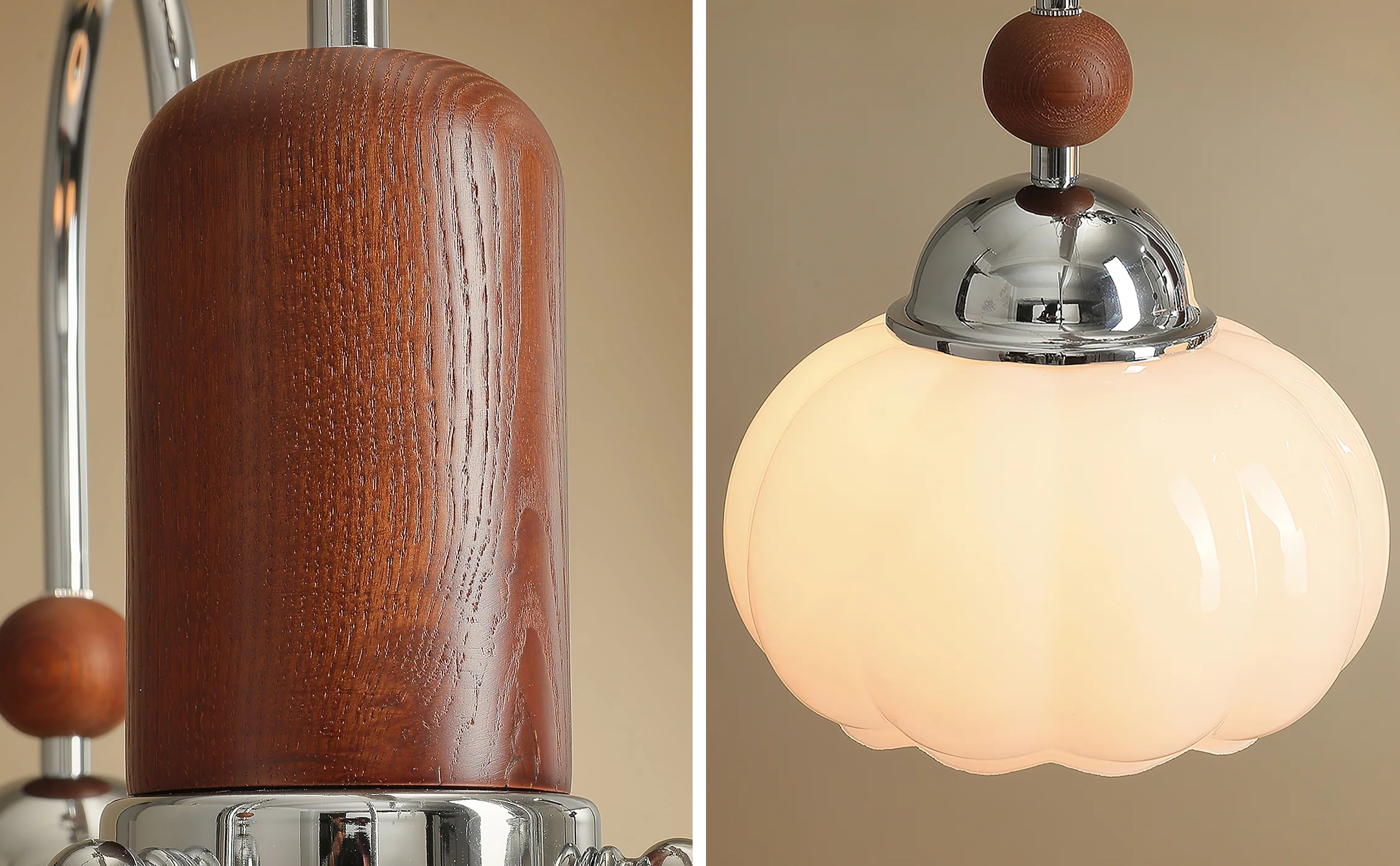 The Pomona Chandelier blends sculptural elegance with a playful spirit. Pumpkin-shaped glass shades rest on sleek chrome arms accented with warm wood, creating a striking harmony of retro character and modern sophistication. Its distinctive silhouette diffuses a gentle, inviting glow, making it a captivating centerpiece for dining rooms, living areas, or any interior that embraces timeless artistry.