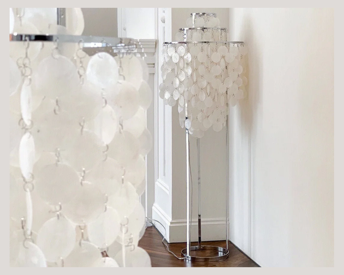 Introducing The Round Shell Floor Lamp, a design that has stood the test of time. Crafted with meticulous detail, its shade is composed of shimmering mother-of-pearl discs that are subtly suspended by three distinct metal rings. This exquisite lamp offers a perfect blend of simplicity and sophistication, making it an essential statement piece for a high-end space. Let this beautiful work of art illuminate and transform your home.