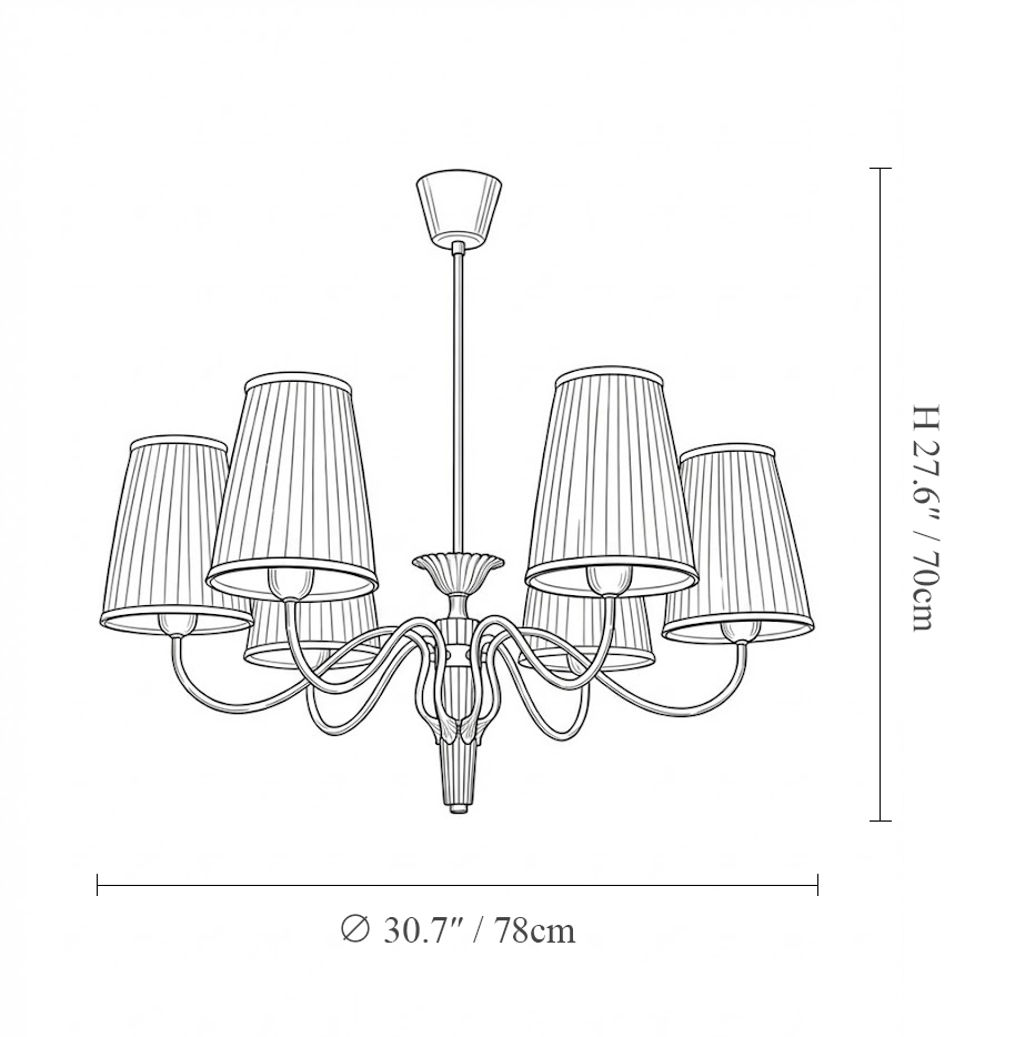 Inspired by Scandinavian lighting from the 1950s, this chandelier combines solid oak accents, refined ironwork, and softly pleated fabric shades. The warm, diffused glow creates a calm and inviting atmosphere without overwhelming the space.