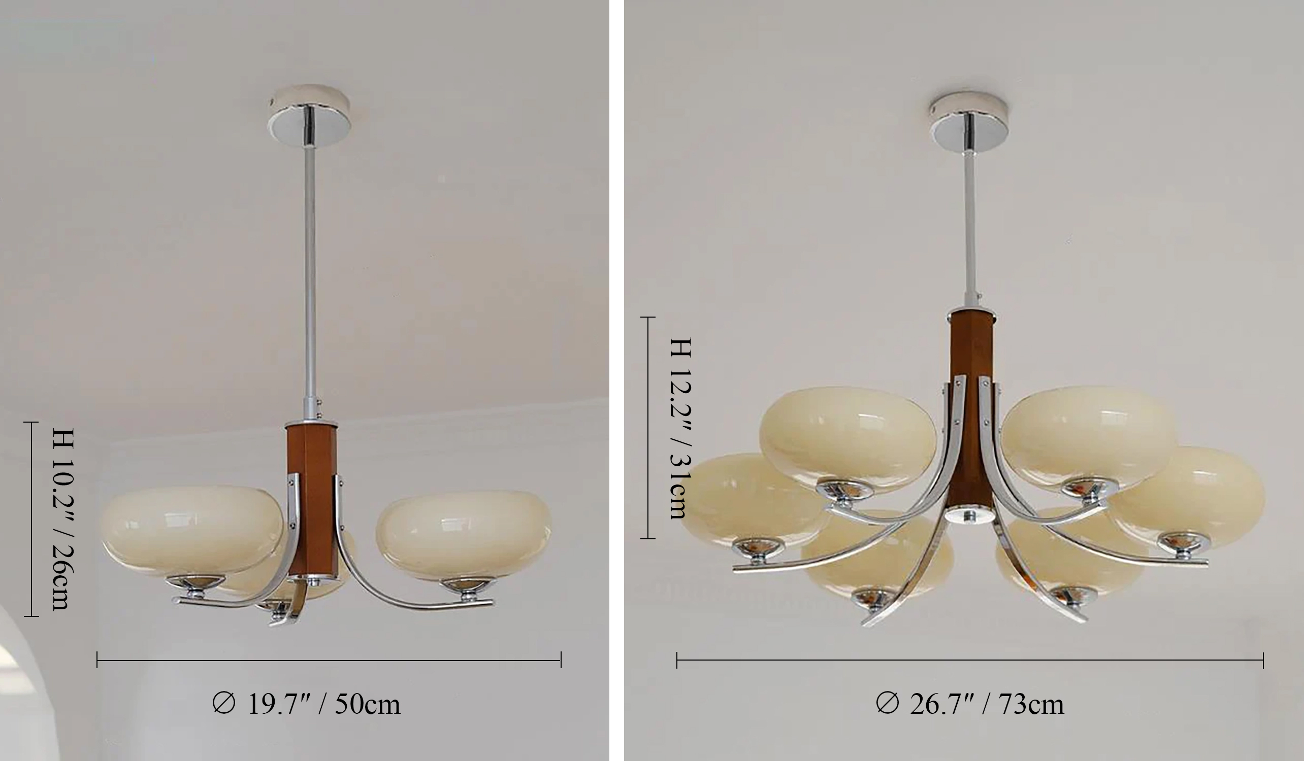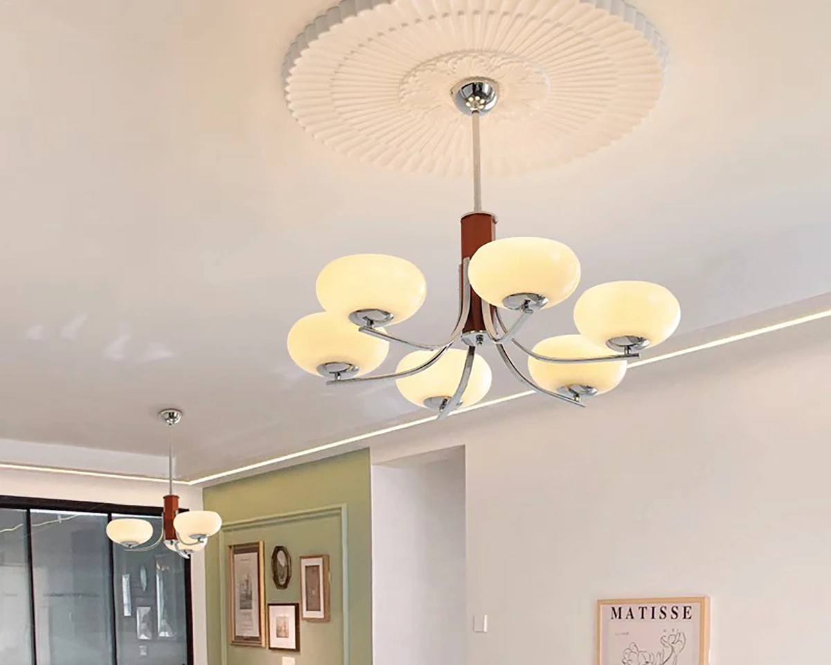 Curved metal arms extend outward like unfolding petals, each supporting a milky-white glass shade that diffuses light into a soft, soothing glow. Unlike harsh illumination that causes fatigue, this chandelier creates a gentle ambiance that nurtures comfort and relaxation in everyday living.