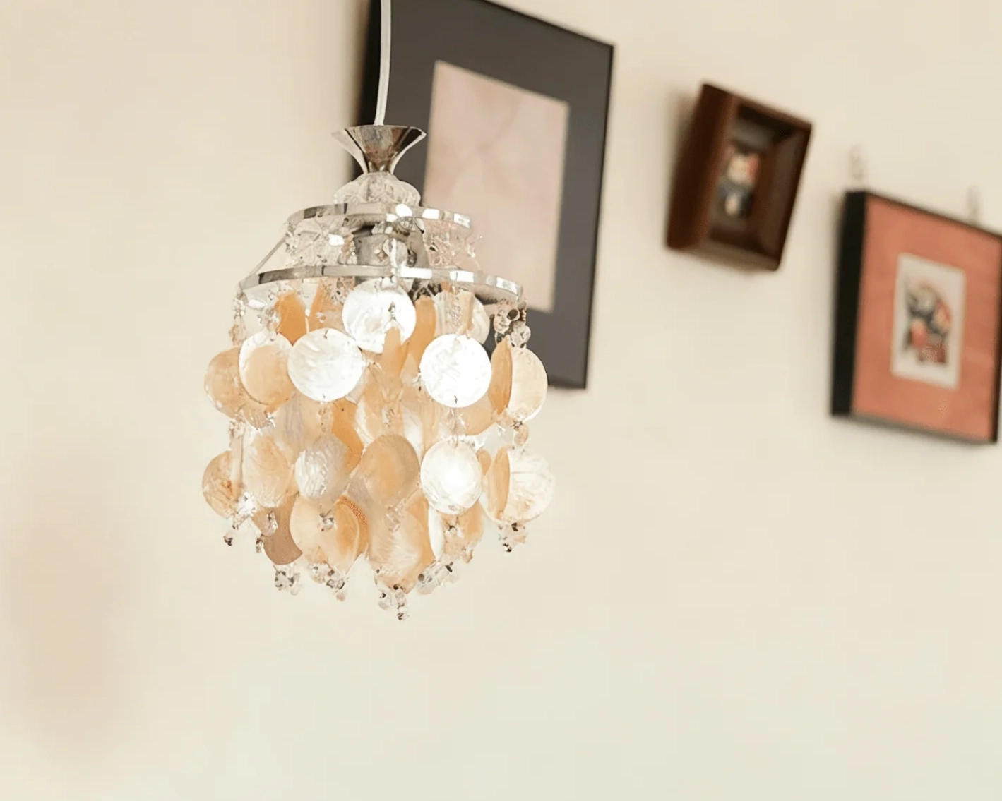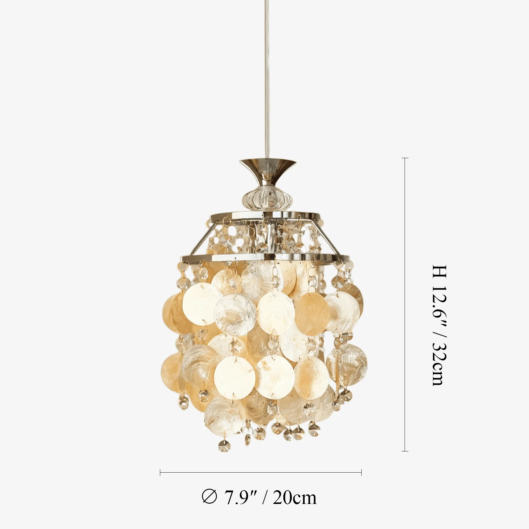 This pendant lamp is adorned with layers of luminous shell discs in soft, pearly hues, delicately accented by shimmering crystals. Supported by a silver-toned metal frame, it exudes refined elegance and subtle coastal allure. When lit, the shells gently diffuse the light, creating a warm, iridescent glow that brings a sense of calm luxury to dining rooms, bedrooms, or any space seeking natural sophistication.