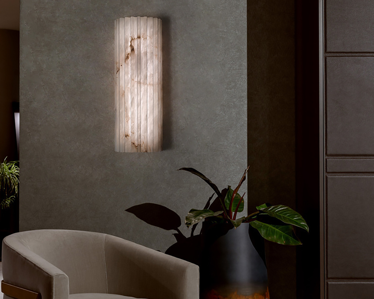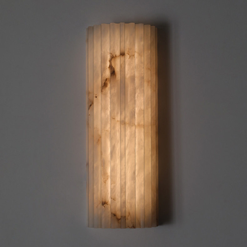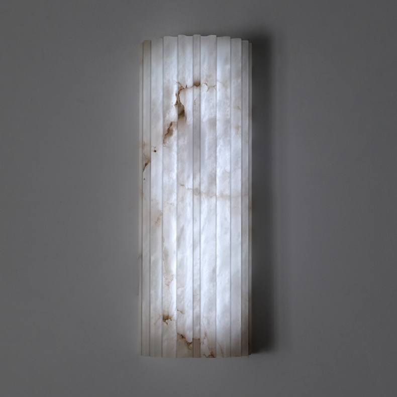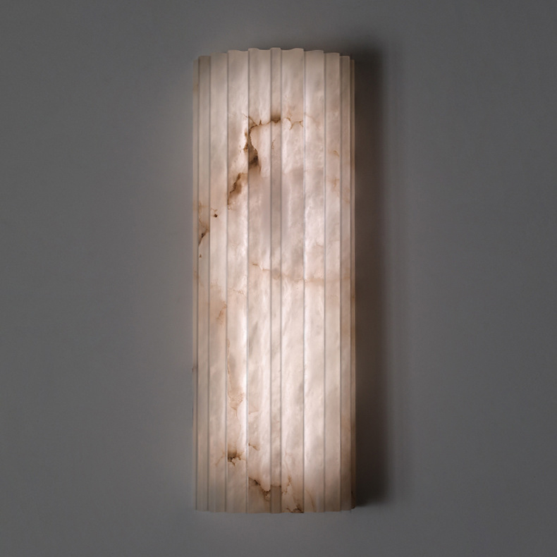 Carved from natural alabaster, the Silent Vein Wall Lamp reveals soft mineral veining beneath a gently fluted form. When illuminated, warm light filters through the stone, bringing the subtle textures to life and casting a calm, atmospheric glow.