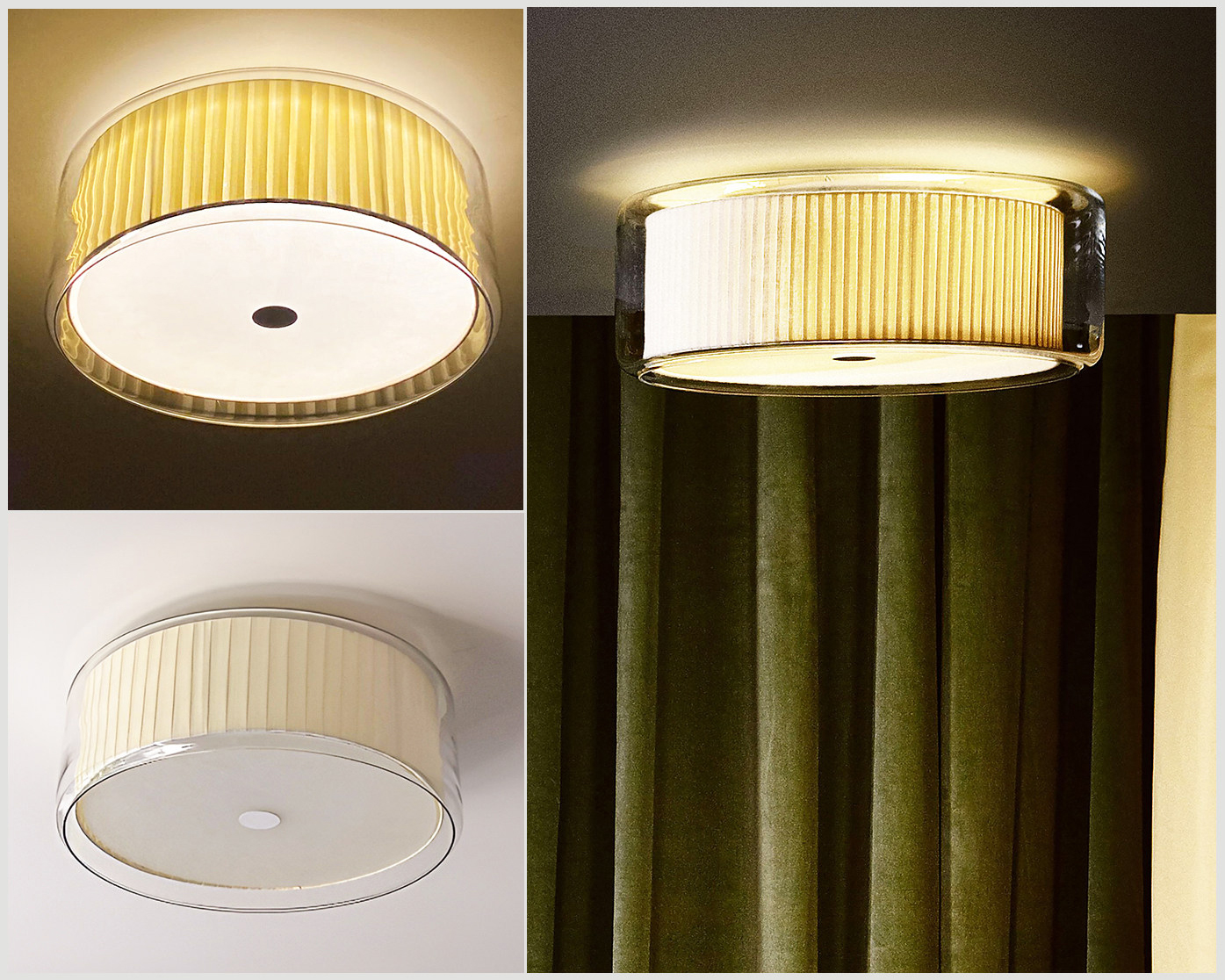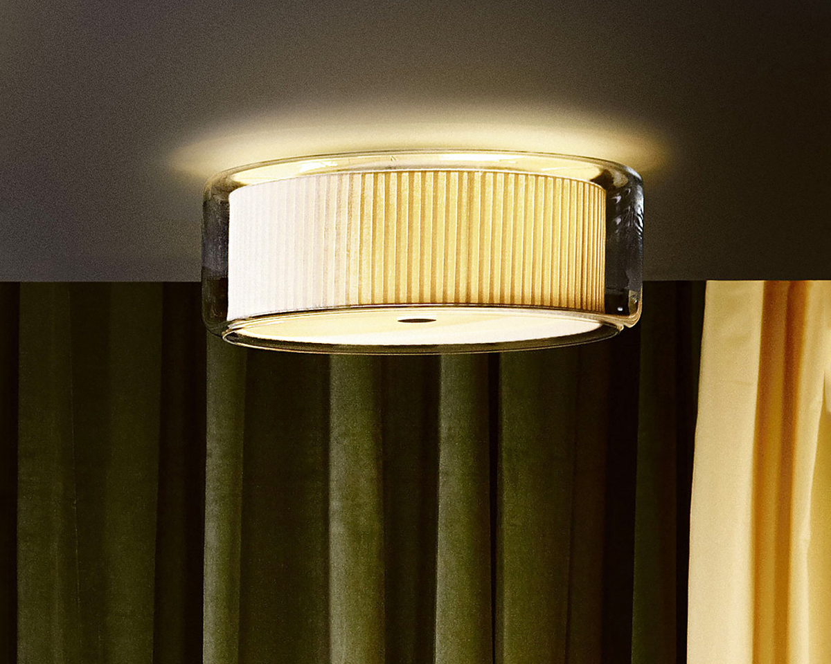 Softline Ceiling Light pairs a clear, mouth-blown glass cylinder with an inner textile shade crafted from cotton. The fabric gently diffuses the light, while the glass outer layer preserves brightness and clarity.