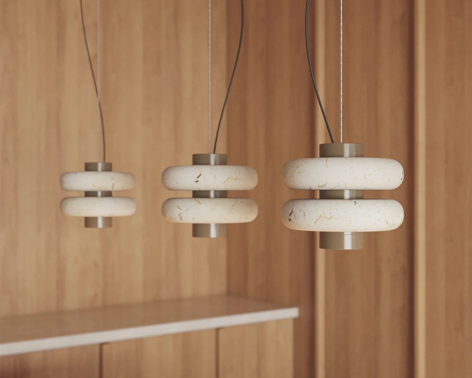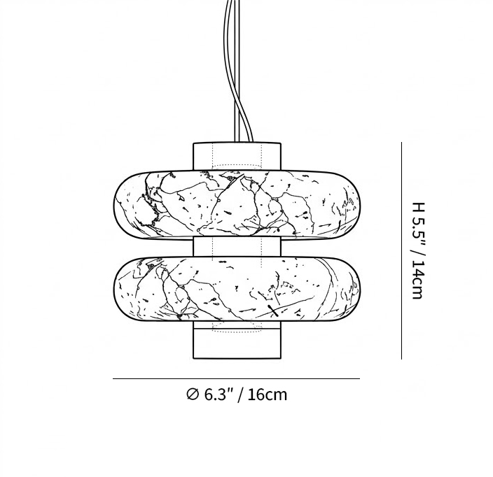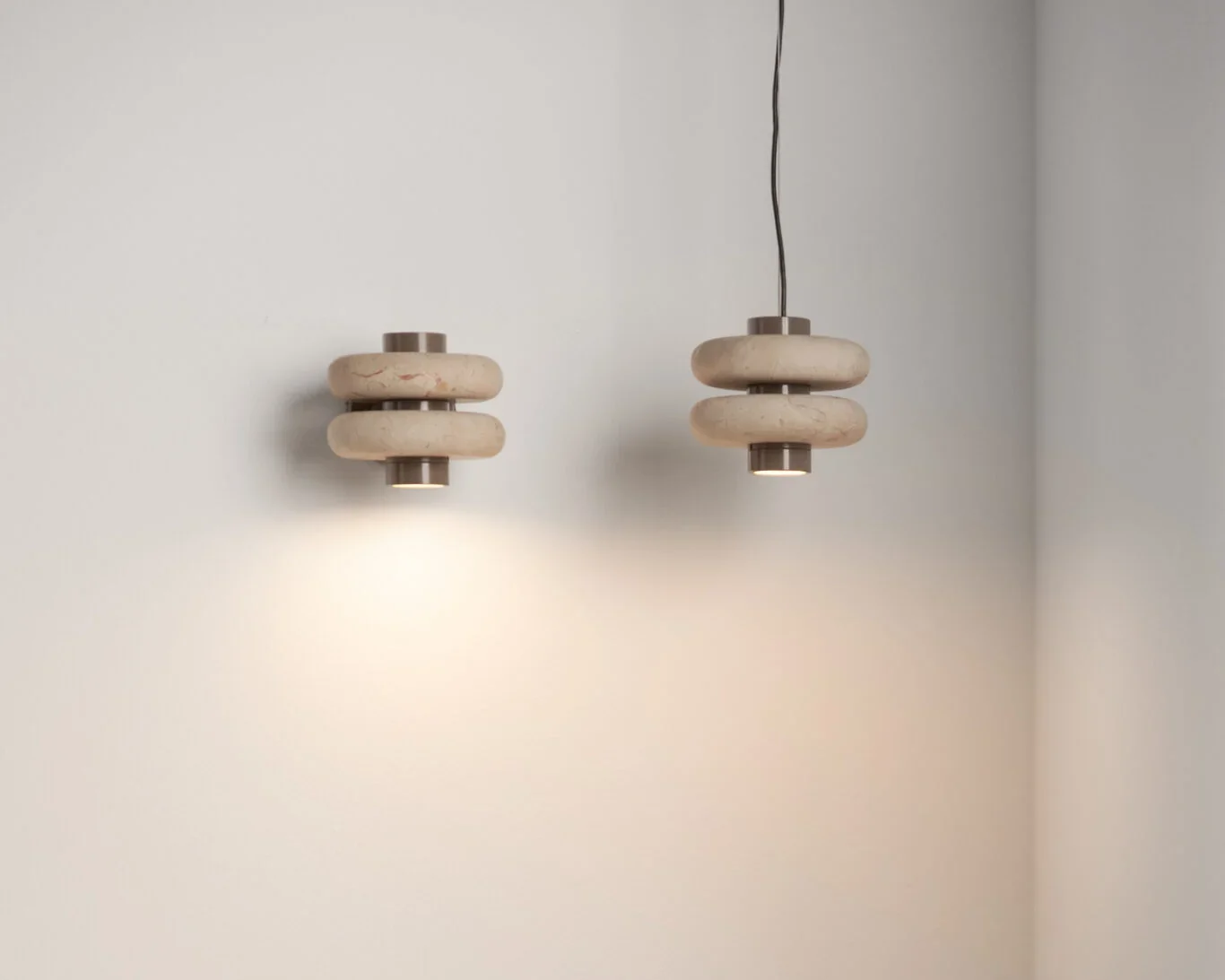 Formed in layered marble, the Strata Ring Pendant brings a sense of quiet weight into the space.