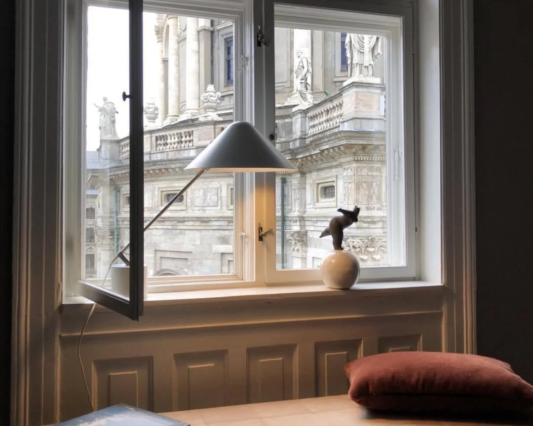 The Swing White Desk Lamp is a minimalist and elegantly designed table lamp featuring a fully adjustable arm. Crafted with a cylindrical solid steel base and a diagonal steel arm, it supports a softly contoured, triangular aluminum shade. Both the base and the shade are finished in a matte white wet lacquer, giving it a clean, modern appeal.