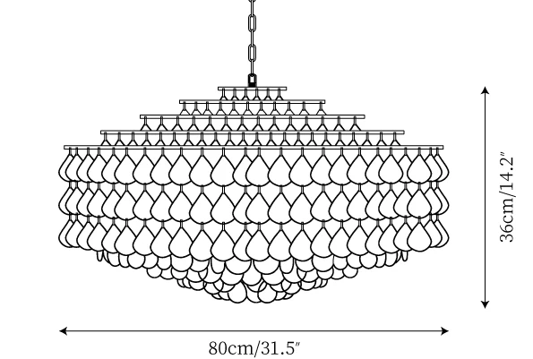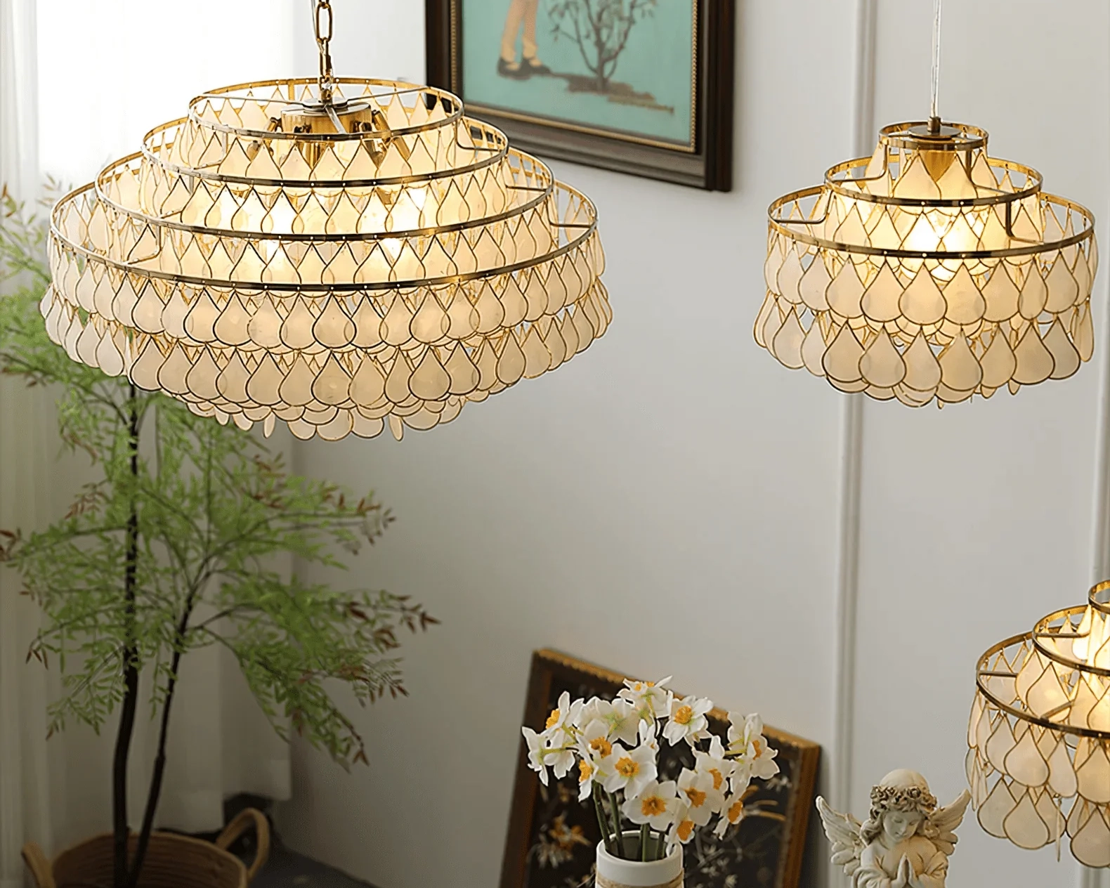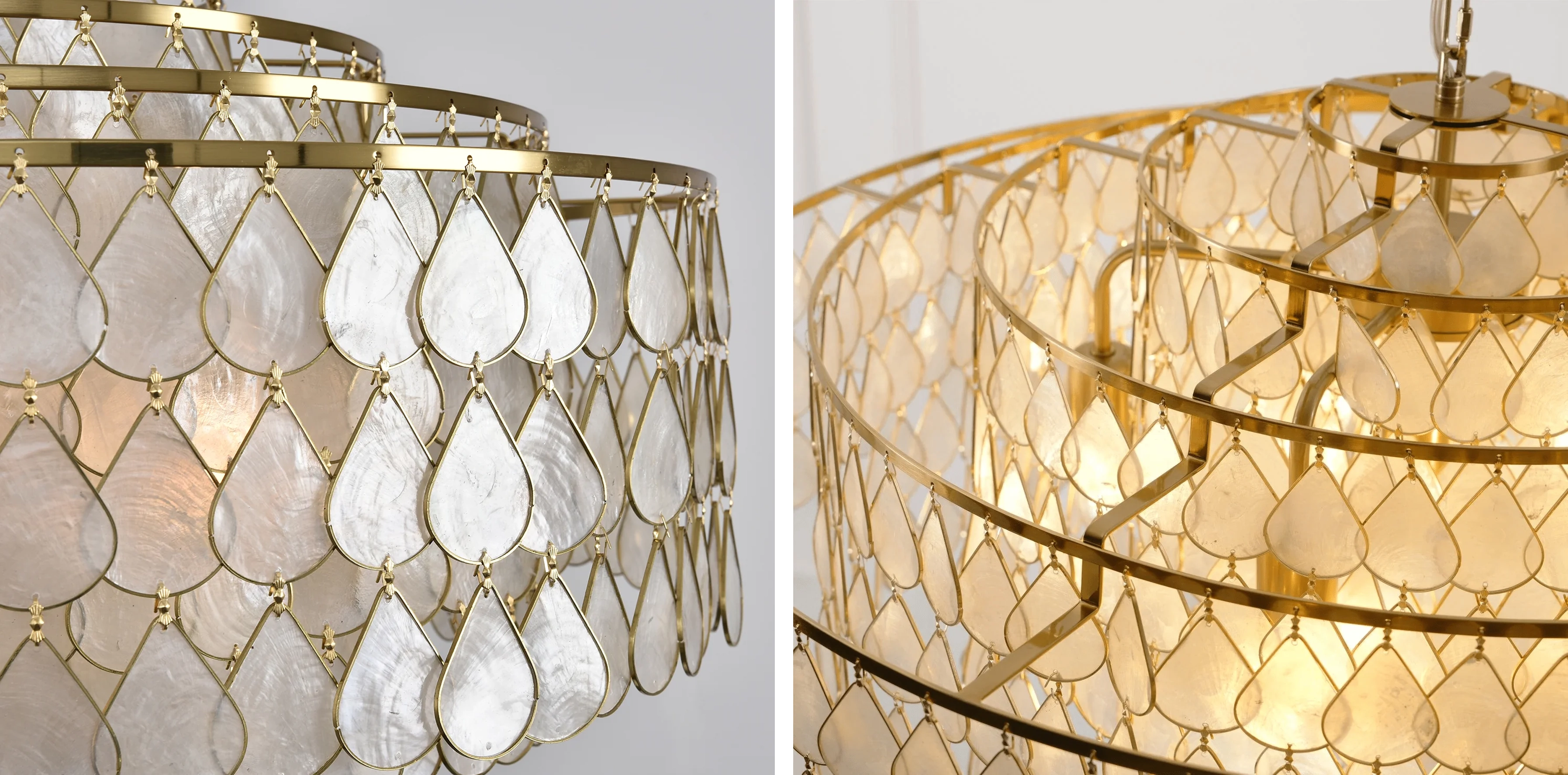 The Teardrops Shell Chandelier showcases exquisite craftsmanship through its delicate cascade of genuine shells framed in shimmering gold. Each teardrop-shaped shell catches and diffuses the light with a soft, radiant glow, evoking a sense of coastal elegance and timeless luxury.