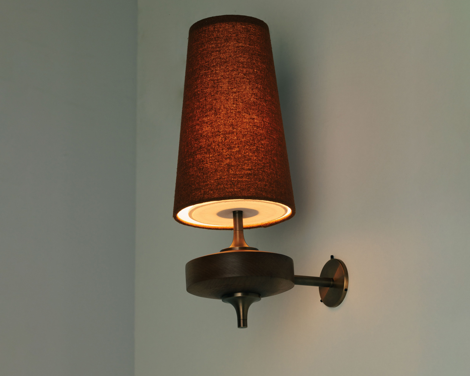 A sculptural wall lamp distinguished by its slender stem, flared spindle accents, and rich terracotta finish. Topped with a classic tapered shade, it casts a soft, inviting glow that enhances both contemporary interiors and refined classic settings.
