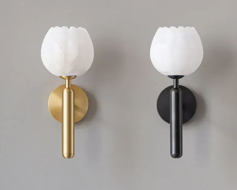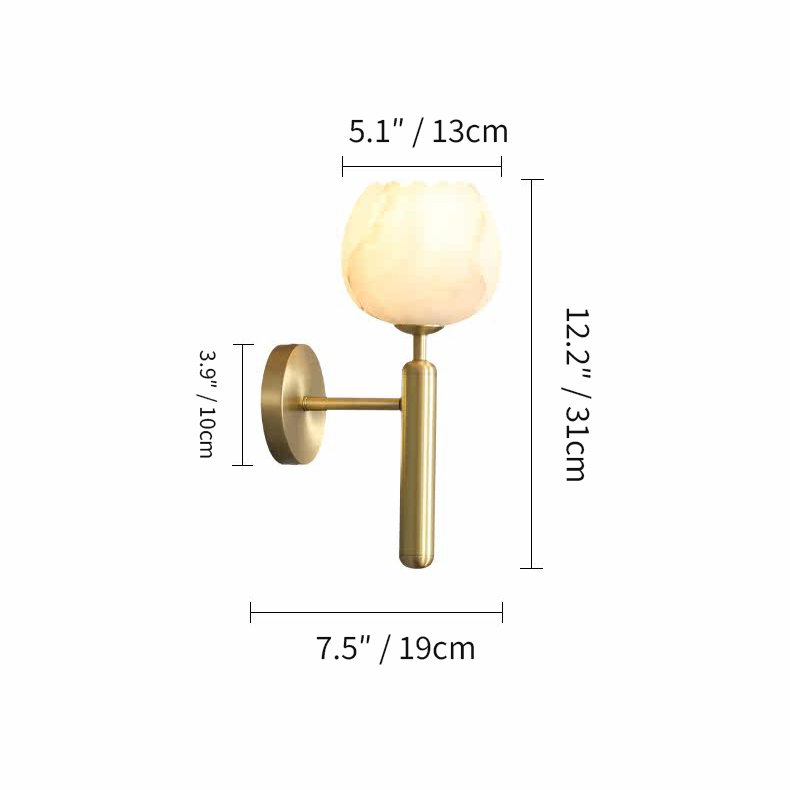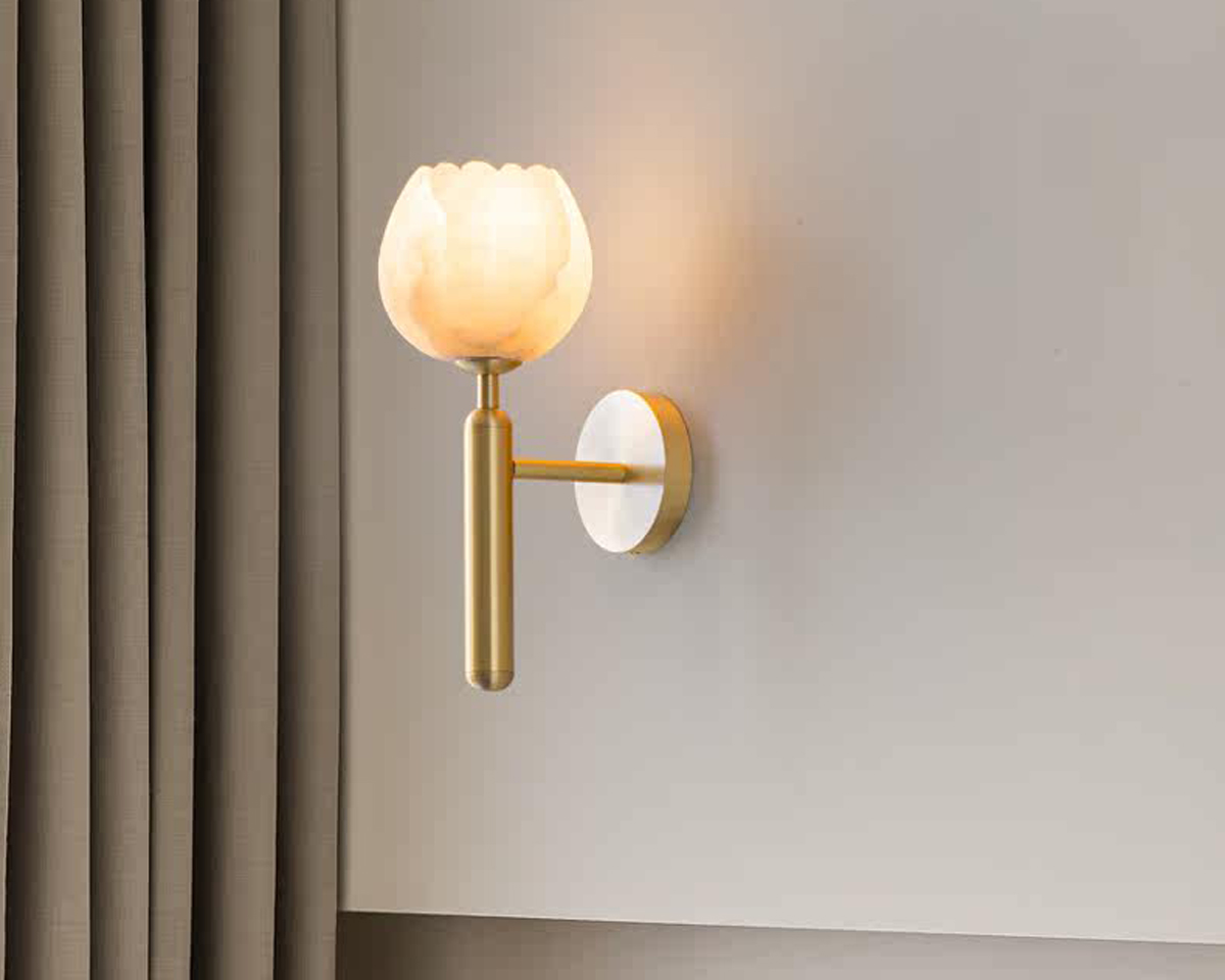 The Tulip Alabaster Wall Sconce brings together sculptural form and soft ambient lighting. Its tulip-shaped alabaster shade gently diffuses light, creating a warm and inviting glow, while the solid brass structure adds a refined, lasting presence.