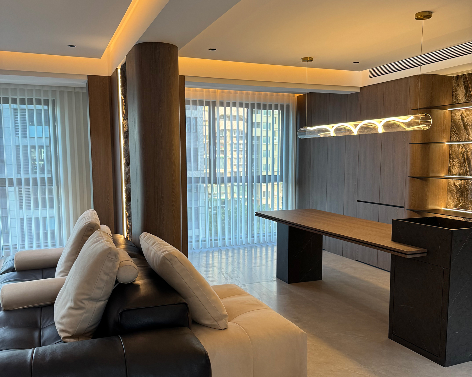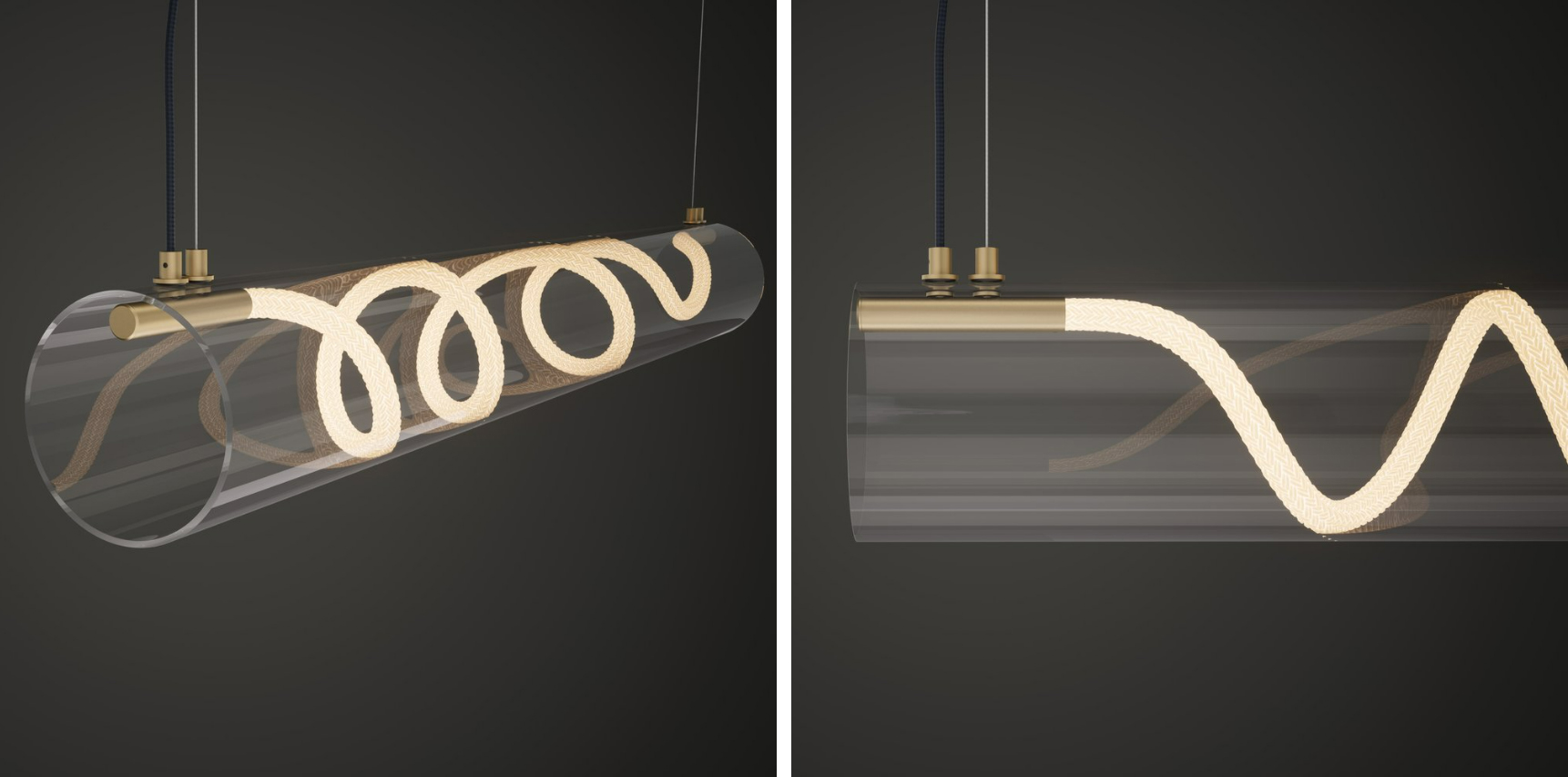 A statement of quiet sophistication — the Vessel Pendant Light features a clear glass tube encasing a softly undulating LED ribbon. When illuminated, gentle light ripples through the transparent vessel, casting fluid reflections that evoke a sense of calm and motion.