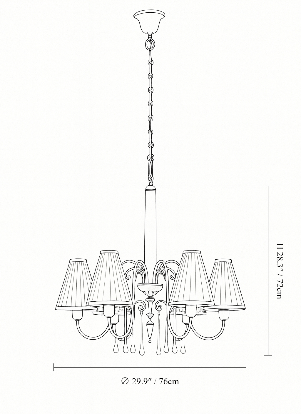 Inspired by the refined aesthetics of 1930s–40s Austria, the Vienna Manor Chandelier brings a quiet sense of heritage to any interior. Its gracefully curved iron arms support pleated fabric shades that cast a warm, inviting glow, while clear glass droplets add a subtle touch of vintage charm.
