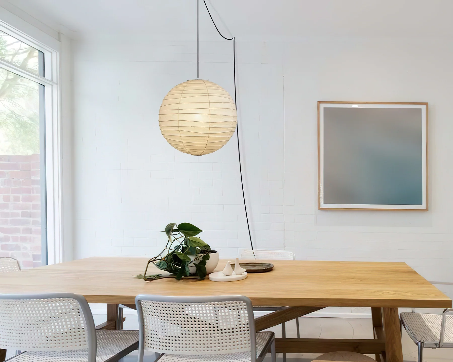 This Washi Paper Pendant Lamp beautifully unites centuries of Japanese craftsmanship with contemporary design. Meticulously handcrafted using traditional washi paper and bamboo ribs, it is reinforced with a sturdy metal frame for lasting durability. A timeless piece, it brings the elegance of heritage and the simplicity of modern form into any living space.