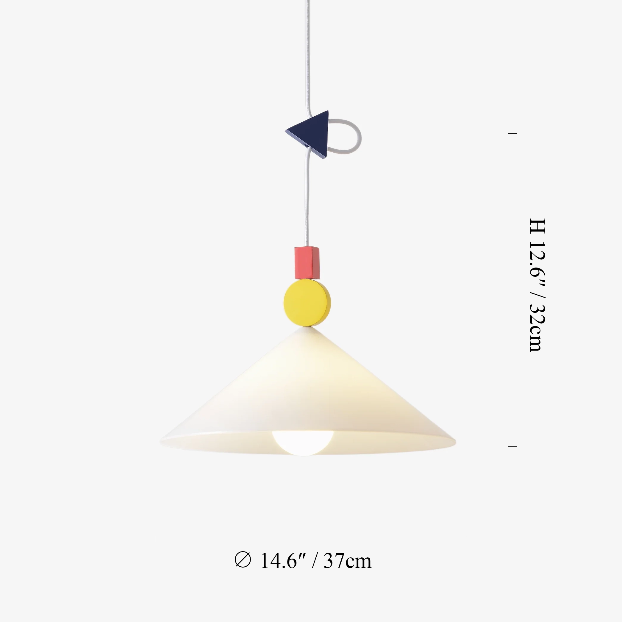 The Whimsical Pendant Lamp showcases a playful fusion of geometry and color. Featuring a mix of triangles, cubes, and circles in rich shades of navy blue, red, and yellow, it brings a cheerful, artistic spirit to any room. The conical shade below casts a gentle, focused glow, balancing form and function. Suspended gracefully from a cord, this pendant adds a creative and modern accent to interiors, infusing spaces with personality and visual rhythm.