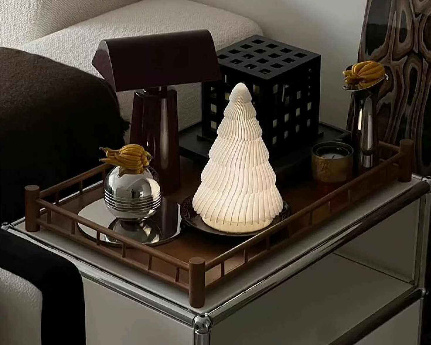Its sculptural form features flowing ridges that softly diffuse the light, creating a peaceful, ambient glow perfect for winter nights. Whether placed on a bedside table, mantel, or under the Christmas tree, it adds a magical touch to any space.