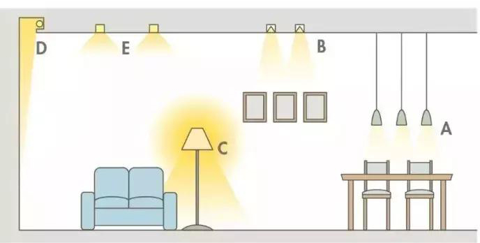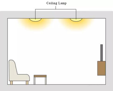 Using a single ceiling light in one room creates a uniform brightness, but the space lacks distinctive atmosphere.