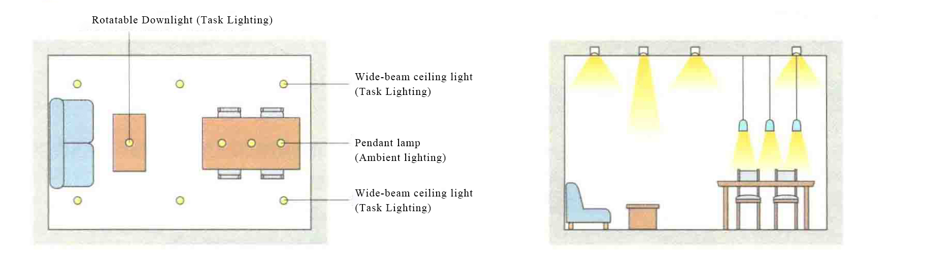 - Wide-beam ceiling lights are suitable as general lighting, ensuring an average floor illuminance of 50–100 lx.