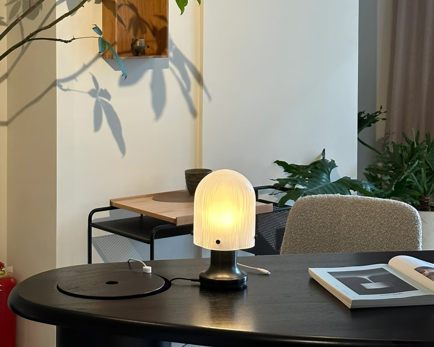 Crafted with a softly tinted umber glass shade, the Umber Table Lamp offers a calm, balanced presence in any interior. The rounded glass gently diffuses light, creating a warm, understated glow without glare. Anchored by a solid metal base, its compact silhouette emphasizes proportion and stability, making it an effortless fit for bedside tables, shelves, or reading corners. Quiet in form yet deliberate in detail, Umber brings a refined sense of order and warmth to everyday spaces.